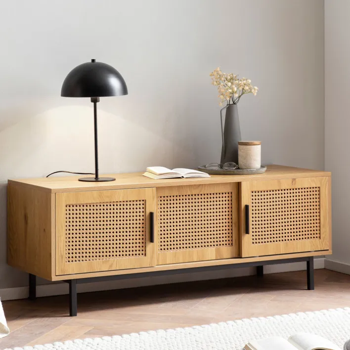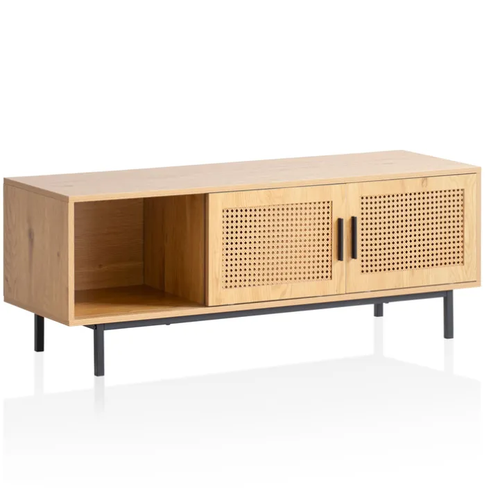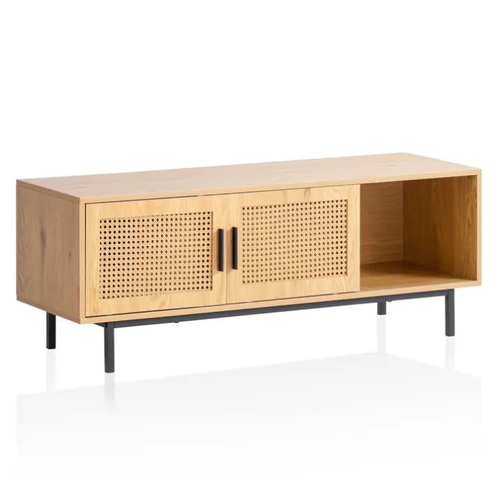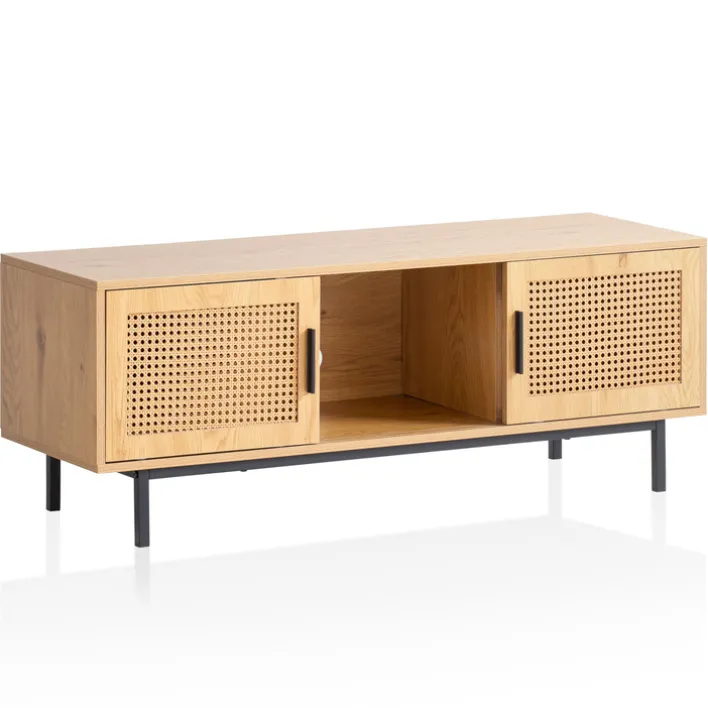 Gefertigt ist das Lowboard aus Holznachbildung und Metall. Es besticht mit seiner einzigartigen Optik, die Polyrattan in Wiener Geflecht und Eiche-Dekor raffiniert verbindet. Ausgestattet ist es mit zwei Schiebetüren und einem offenen Fach, die viel Stauraum bieten. Auch auf seiner Oberseite können verschiedene dekorative Gegenstände oder Lampen aufgestellt werden. Für einen stabilen Stand sorgen die Füße aus pulverbeschichtetem Eisen. Das Lowboard gliedert sich perfekt in fast jede Wohnzimmereinrichtung ein und trägt zu einer gemütlichen Atmosphäre bei.