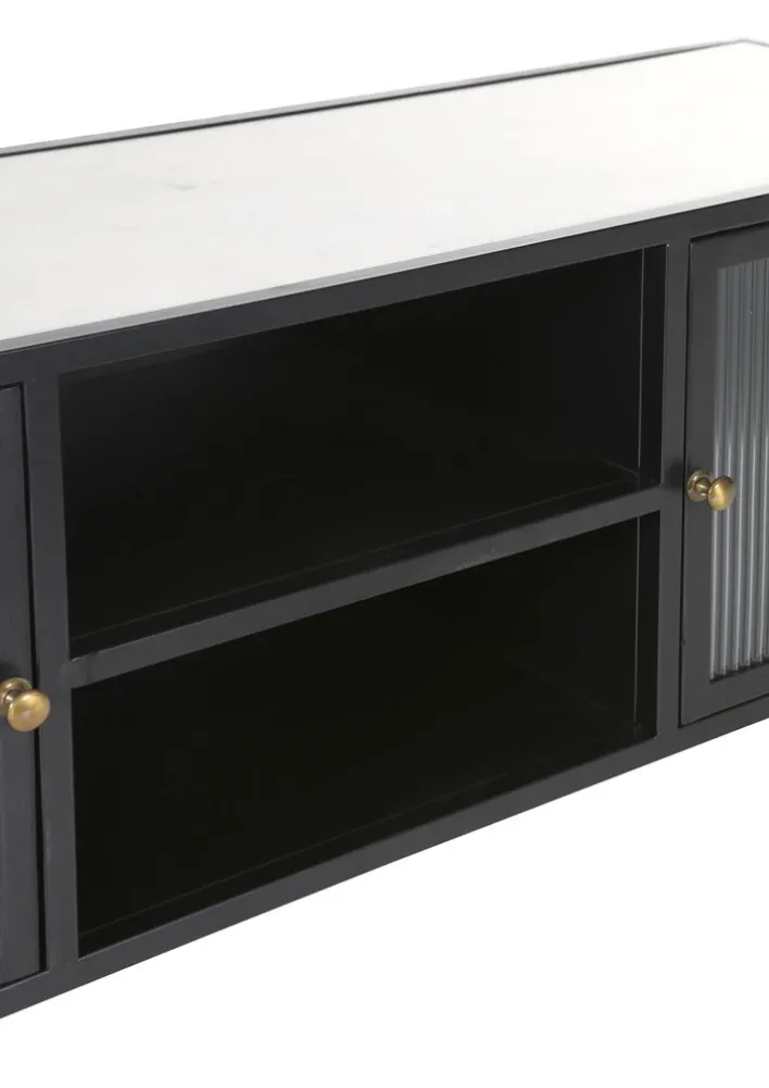 Dieses schicke Lowboard mit einer Tiefe von 43 cm ist ein Blickfang in jedem Wohnzimmer. So ist seine Hauptfarbe Schwarz; diese bildet einen spannenden Kontrast zur weißen Marmorplatte und den goldenen Griffen – welche sich an den beiden Drehtüren befinden. Hinter diesen Drehtüren ist staubgeschützter Stauraum. Darüber hinaus hat die Kommode zwei offene Fächer; diese sind ideal für Dinge, auf die man einen schnellen Zugriff wünscht.