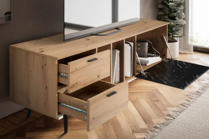 Das in einer interessanten Kombination aus Marmor-Optik und Eiche-Dekor gestaltete Lowboard in der Größe 150 x 55 cm bietet mit seinem Erscheinungsbild spannende Eindrücke: Es schafft warme, behagliche Wohnmomente. Einer der Hauptaspekte, die für einen Kauf des Lowboards sprechen, liegt jedoch in der Multifunktionalität dieses Möbelstücks begründet.