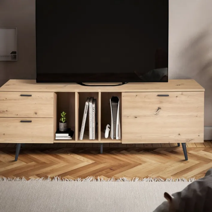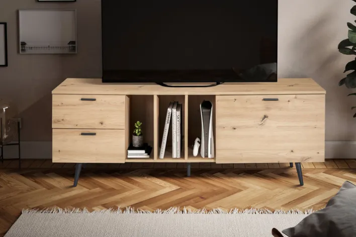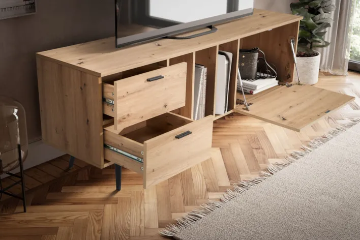 Optisch sorgt das Lowboard in Eiche-Dekor mit matter Oberfläche für eine wohnliche Atmosphäre. Gleichzeitig ist es unempfindlich und pflegeleicht sowie vielseitig nutzbar. Es kann mit bis zu 30 kg belastet werden. Die beiden Schubkästen bieten viel Stauraum für Kleinteile und hinter der großzügig dimensionierten Klappe können auch etwas größere Gegenstände verschwinden. Dazu kommen drei hochformatige, offene Fächer, die zum Beispiel Ordner, repräsentative Bücher oder Schallplatten aufnehmen können.