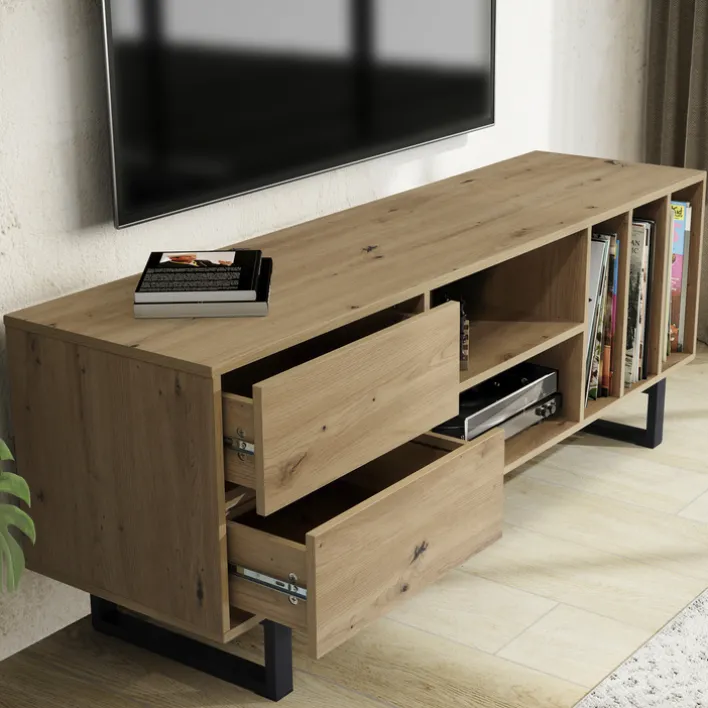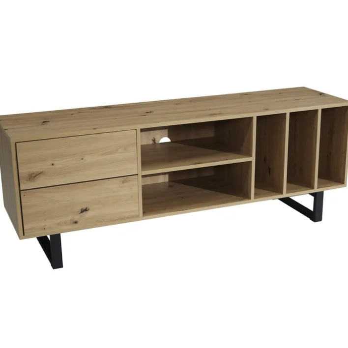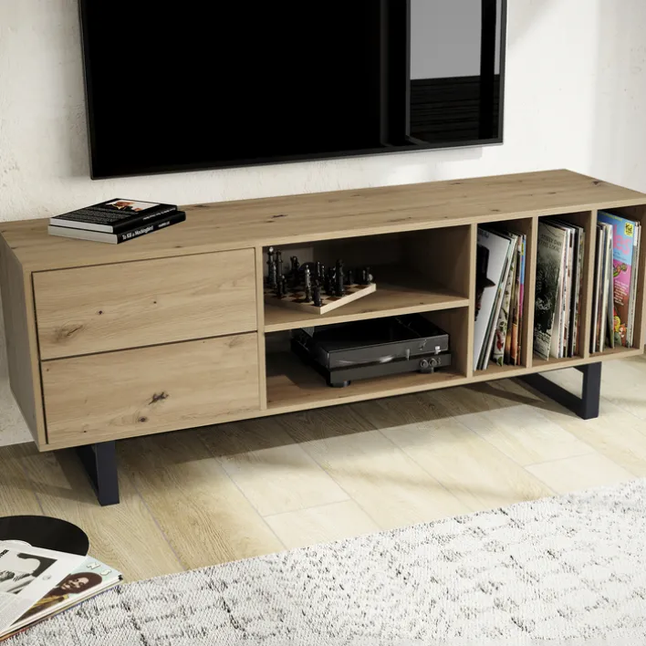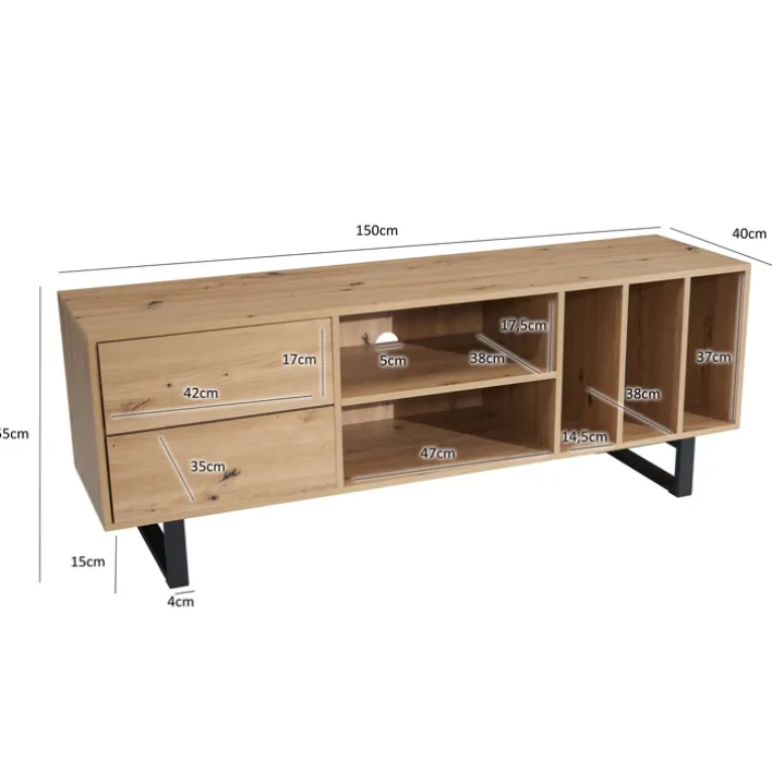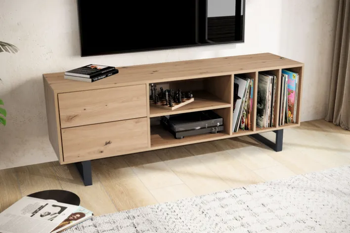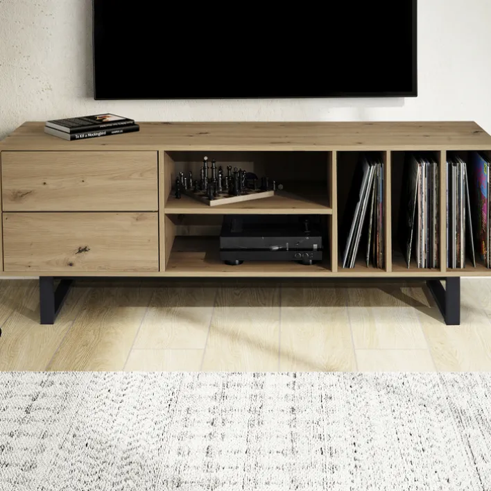 Das vielseitige Lowboard hat die Maße 150 x 55 x 40 cm und passt in den modern eingerichteten Wohnbereich. Das fein gemaserte Eiche-Dekor und ein Kufengestell in der Farbe Schwarz verleihen dem Lowboard einen modernen Look und es sind verschiedene Kombinationen mit bereits vorhandenen Möbeln möglich. Viel Platz und Stauraum für verschiedene Accessoires und Unterhaltungselektronik bieten fünf offene Fächer und zwei Schubkästen. Das hochwertige Lowboard schafft ein gemütliches Ambiente.