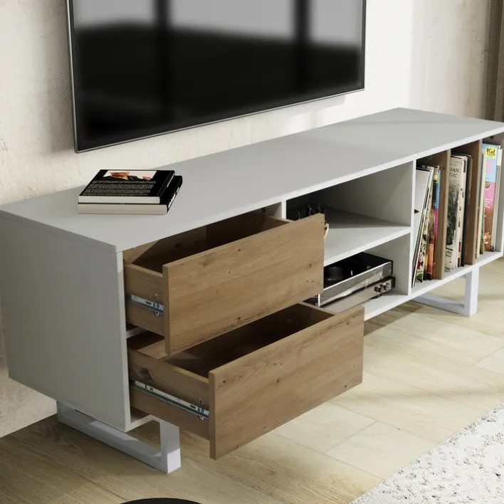 Dieses minimalistisch gestaltete Lowboard überzeugt mit klaren Linien. Mit seinen Abmessungen von 150 x 55 x 40 cm bietet es ausreichend Stauraum mit zwei Schubkästen und fünf offenen Fächern. Die Kombination aus weißen Flächen und einem Eiche-Dekor in Holzoptik verleiht dem Design eine moderne Note.