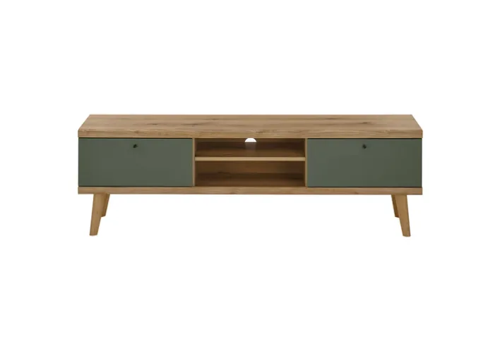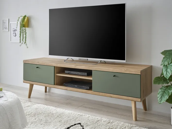 Salbeifarbig und mit einer kräftigen Note Braun erzeugt das ALVA Lowboard in der Größe 160 x 50 cm wohnliche Impressionen, wie man sie aus Kolonialzeiten kennt. Der flache TV-Schrank kann sowohl für Fernsehzubehör, als auch für dekorative Gegenstände und als Aufbewahrungslösung zum Einsatz kommen.