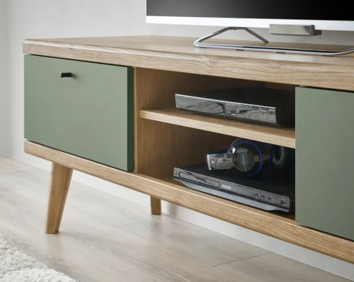 Für ein auflockerndes Design, welches Räume optisch nicht einengt, setzt der Hersteller bei dem Lowboard auf eine Kombination aus offenen und geschlossenen Fächern. Letztere lassen sich mithilfe von Klappen öffnen. Das Lowboard hat ein massives Gestell sowie einen Korpus aus Eiche mit einem attraktiven Evoke-Dekor. Bei der Front handelt es sich um eine Nachbildung von Holz.