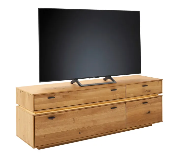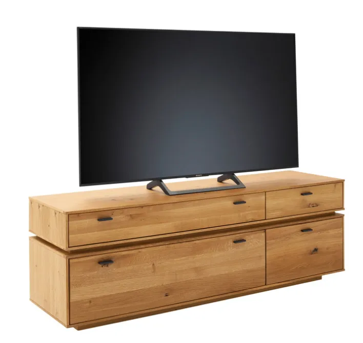 Das hochwertig verarbeitete Holz des Lowboards ist teilmassiv. Die Oberflächen sind geölt und haben eine feine Maserung. Die Beschläge für die leicht laufenden Schubkästen und die lackierten Griffe an der Front sind aus Metall gefertigt. Das Lowboard ist bei Bedarf mit einer Beleuchtung nachrüstbar.