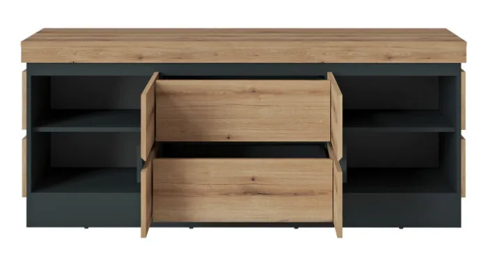 Das 161 cm breite Lowboard eignet sich erstklassig, um dem Wohnzimmer in optischer wie praktischer Hinsicht neue Impulse zu verleihen. Es bringt natürlichen Charme und Funktionalität gekonnt zusammen. Auf dem Lowboard lassen sich TV-Bildschirme perfekt platzieren. Zugleich bietet es aber auch jede Menge Stauraum für die unterschiedlichsten Gegenstände. Jeweils zwei Drehtüren und Schubkästen sorgen dafür, dass neugierige Blicke sie nicht gleich entdecken. Die Türen schließen leise. Hinter ihnen erlauben zwei Einlegeböden eine flexible Nutzung.