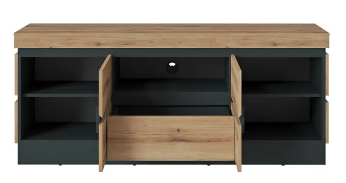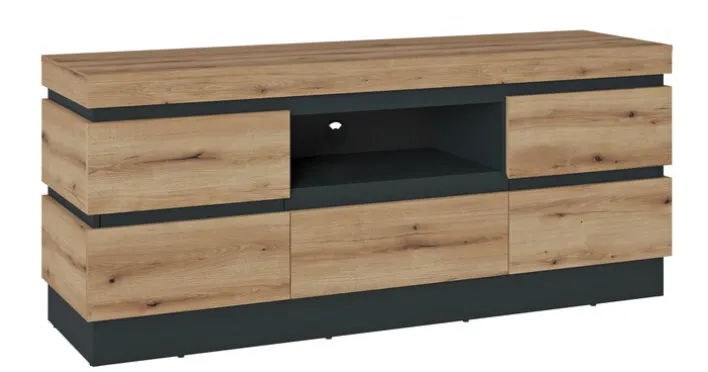 Mit seinen auffälligen Fronten im dekorativen Eichenlook strahlt das Lowboard CORTE II eine robuste Gemütlichkeit aus, die in Wohnzimmer oder Eingangsbereich perfekt zur Geltung kommt. Aufgelockert wird die Holzoptik durch gerade Linien und einen schmalen Sockel in Dunkelgrau. 161 cm breit und 68 cm hoch bietet die Kommode mit dem offenen Fach im Mittelteil jede Menge praktischen Stauraum.