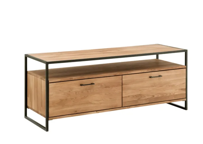 Das Lowboard der Serie FRAME vereint Funktionalität und modernes Design im Industrial-Stil. Mit einer Breite von 155 cm, einer Höhe von 60 cm und einer Tiefe von 52 cm bietet es großzügigen Stauraum. Die Kombination aus massivem Eichenholz und einem pulverbeschichteten Metallrahmen verleiht dem Möbelstück eine robuste und zugleich elegante Optik. Die geölte Oberfläche des Holzes betont die natürliche Maserung und sorgt für eine warme Ausstrahlung.