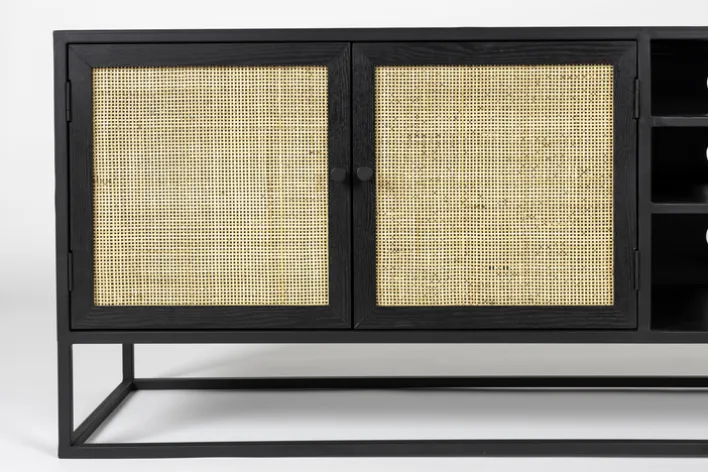 Das stylische Highboard JOANNA kombiniert ein schwarz pulverbeschichtetes Metallgestell mit schwarz lackierter Holznachbildung und natürlichem Rattangeflecht. Es hat eine Größe von 80 x 100 x 38 cm und lässt sich auch sowohl in Esszimmer als auch in offene Wohn-Essbereiche integrieren. Hinter den zwei Drehtüren mit Magnetverschluss bietet das Highboard Platz für Geschirr, Gläser und vieles mehr. Sehen lassen kann sich auch die geräumige Oberplatte, die sich zum Abstellen von Dekorationen und kleine Zimmerpflanzen anbietet.