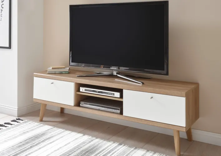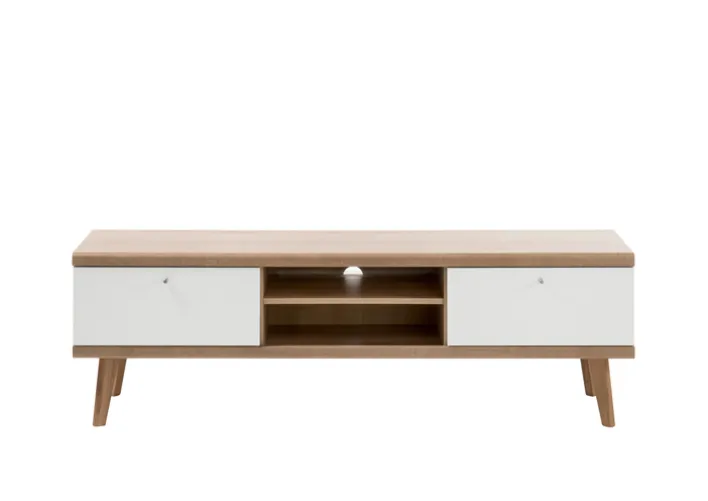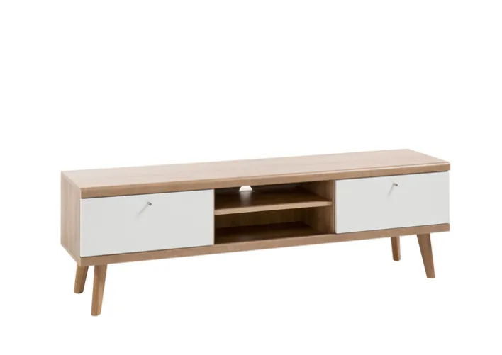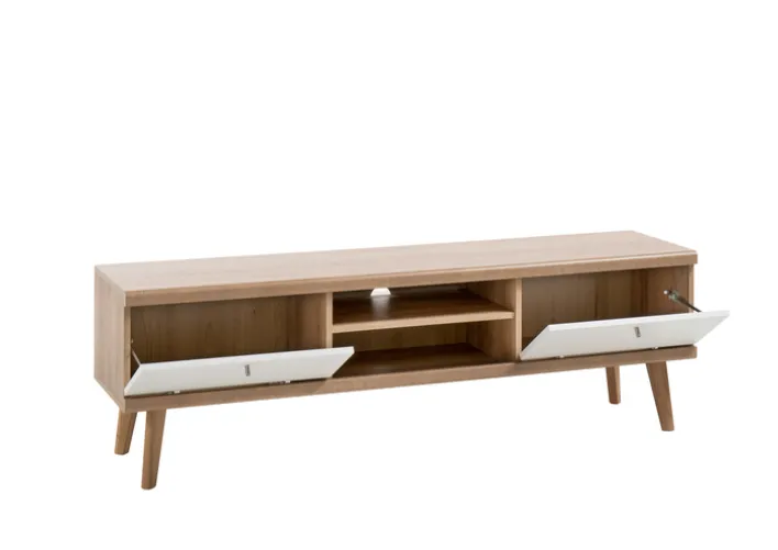 Das Lowboard besteht aus Holznachbildung und ist in einer matten Optik gehalten, die für eine moderne und zugleich pflegeleichte Oberfläche sorgt. Es verfügt über zwei offene Fächer und zwei Klappen, die zusätzlichen Stauraum bieten und eine aufgeräumte Optik gewährleisten. Die stabilen Beine aus Holzwerkstoffart Spanplatte verleihen dem Möbelstück eine solide Standfestigkeit. Dieses Lowboard ist die ideale Wahl für alle, die Funktionalität und stilvolles Design in ihrem Wohnzimmer vereinen möchten.