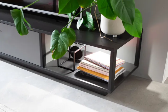 Das Lowboard kann solitär oder als Teil einer Wohnwand gestellt werden. Es besitzt auf der oberen Ablage genügend Platz für das TV-Gerät sowie Dekorationen. Auch das offene Fach bietet sich für schicke Vasen oder Bücher an. Die breite Schublade dagegen hält Stauraum für elektronisches Equipment oder CDs bereit. Die dezente Farbgebung passt sehr gut in moderne Interieurs.