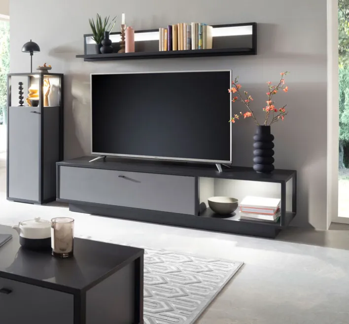 Das Lowboard LUXOR ist 186 cm breit und 43 cm hoch. Die Tiefe liegt bei 50 cm. Es zeigt die Farben Royal Grau und Anthrazit. Zudem besitzt es 1 Schubkasten und 1 offenes Fach. Das Möbelstück ist aus MDF-Spanplatten und Melaminharz hergestellt.