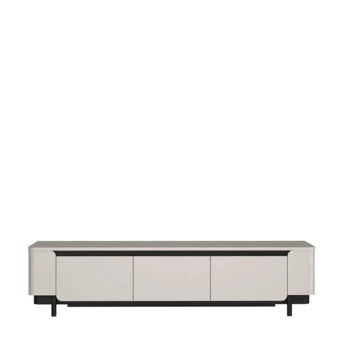 Das zweifarbige Lowboard VODOL mit einer Größe von 205 mal 49 cm ist mit drei Drehtüren ausgestattet. Das Soft-Close-System sorgt dafür, dass sich die Türen beim Schließen langsam in die Endposition bewegen.