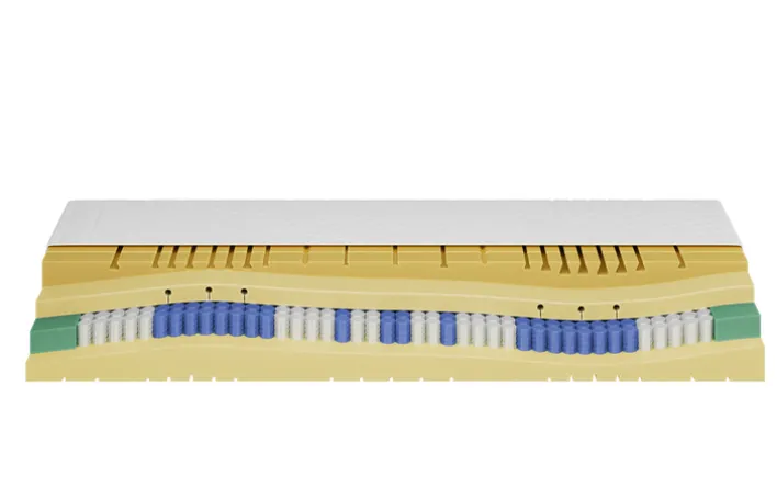 Der Polsteraufbau der Matratze kombiniert Kaltschaum mit einem Taschenfederkern, was für eine optimale Unterstützung und Komfort sorgt. Die Matratze verfügt über 7 Zonen, die sich an die Körperkonturen anpassen und so für eine ergonomische Liegeposition sorgen. Der Härtegrad ist hart, was besonders für Personen geeignet ist, die eine festere Unterlage bevorzugen. Das Material besteht aus 100 % Polyester, einer Synthetikfaser, die für ihre Langlebigkeit und Pflegeleichtigkeit bekannt ist.