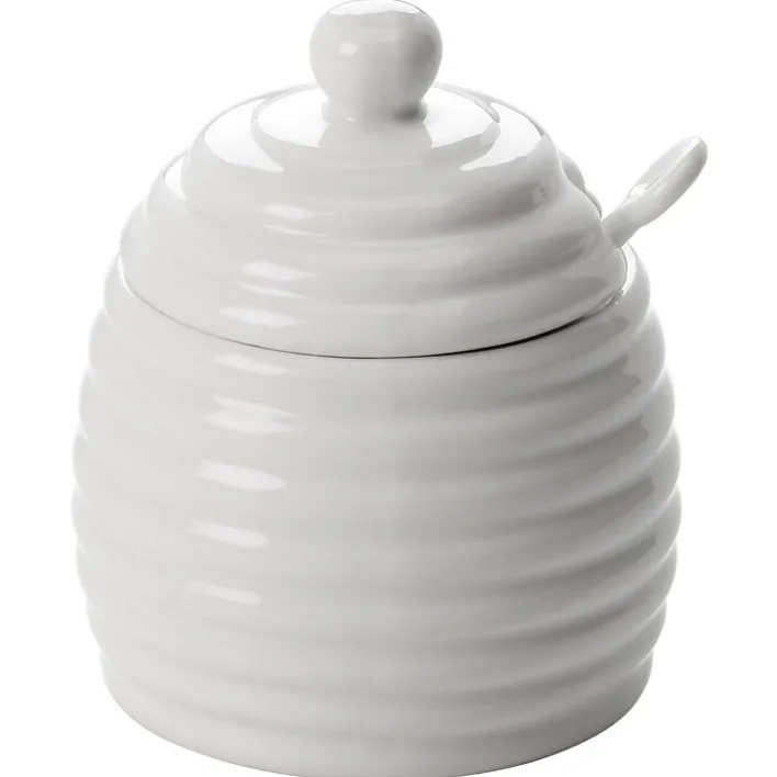 Der attraktive Honigtopf BASICS in einem schlichten Weiß ist ein zeitloses Küchenutensil aus dem Hause des Herstellers MAXWELL & WILLIAMS. In dem Honigtopf lässt sich Flüssighonig auf stilvolle Weise aufbewahren. Der Honigtopf ist aus Porzellan gefertigt und mit einem speziell für Honig konzipierten Löffel versehen. So kann dieser hygienisch aus dem Topf entnommen werden, ohne dass er daneben kleckert.