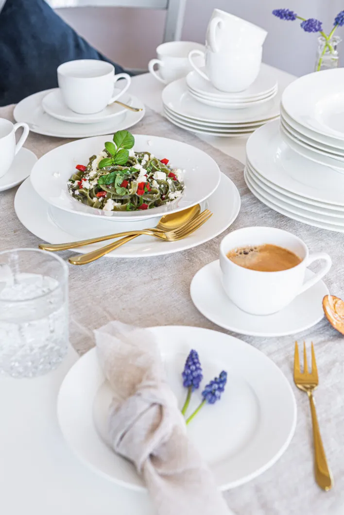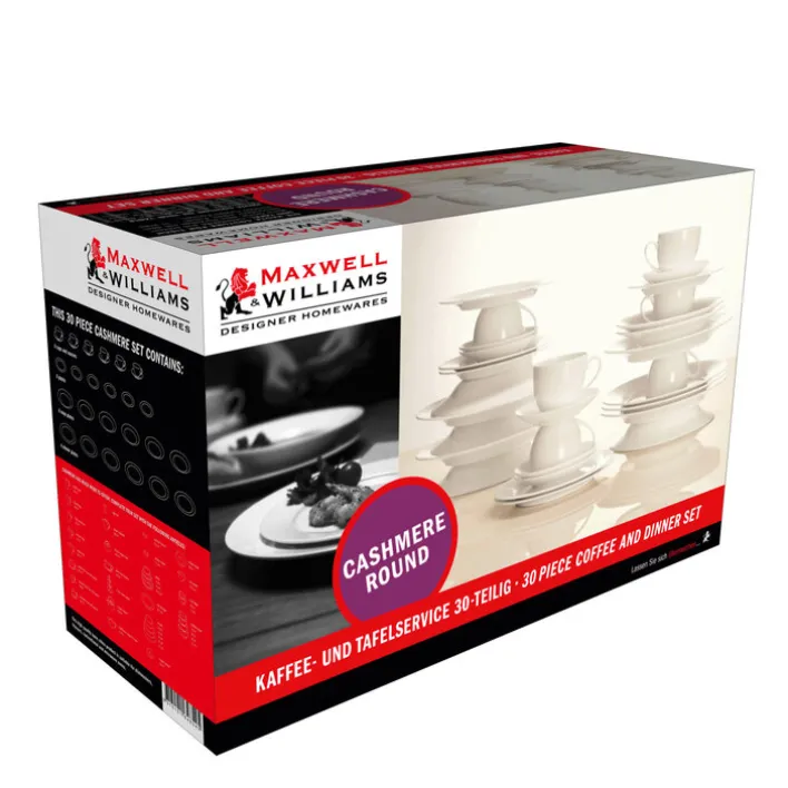 Das MAXWELL & WILLIAMS Kaffeeservice CASHMERE besteht aus exklusivem Bone China Porzellan, sodass Sie sich für ein echtes Premium-Set enthalten, das backofen-, gefrier- und mikrowellengeeignet ist. Selbstverständlich können Sie die einzelnen Teile problemlos in der Spülmaschine reinigen. Das Design ist klar und schnörkellos und somit herrlich zeitlos und vielseitig kombinierbar. Das Set bietet Ihnen sechs Kaffeetassen mit den passenden Untertassen, sechs Dessertteller, sechs Speiseteller und sechs Suppenteller, sodass es für Mittagessen, Abendessen und Kaffee und Kuchen gleichermaßen genutzt werden kann.