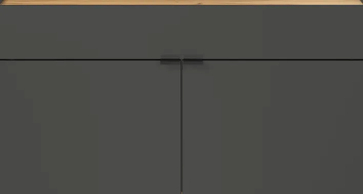 Der Mehrzweckschrank DAVID in den Maßen 56 x 97 cm besitzt einen Schubkasten und zwei Türen. Dahinter befinden sich vier Einlegeböden. Er hat nur eine Tiefe von 22 cm und passt somit auch in kleine Räume wie Vorzimmer oder Wohnungsflur. Der Schrank besitzt eine Melaninharzbeschichtung in den Farben taupegrün/braun. Das Dekor ist der Navara-Eiche nachempfunden.