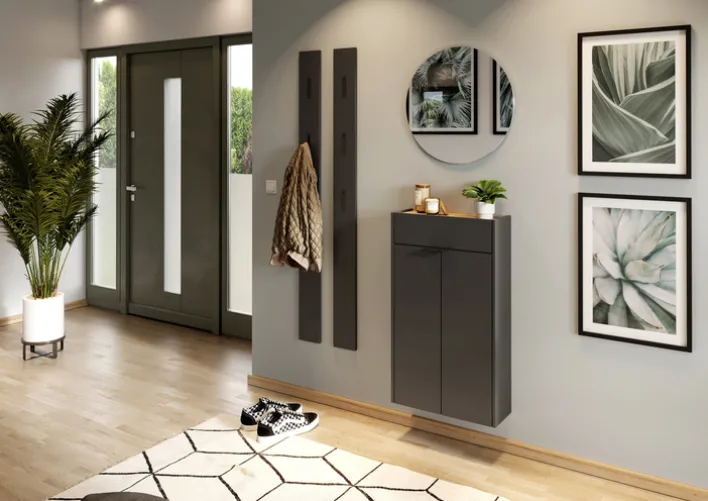 Kleine Kantengriffe erleichtern das Öffnen. Für ein geräuschloses Schließen sind Türdämpfer eingebaut. Der Schubkasten besitzt zudem einen Soft-Close-Selbsteinzug. Der Mehrzweckschrank ist rundum mit ABS-Schutzkanten versehen. Er besitzt weder Beine noch Sockel und wird deshalb an der Wand befestigt. Eine robuste Konstruktion mit pflegeleichter Oberfläche.