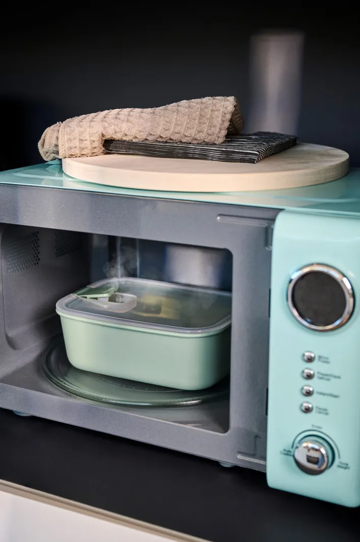 Das stapelbare Set besteht aus einer 1 Liter Dose und zwei 700 ml Dosen. Dank der Verwendung von BPA-freiem Kunststoff sind die Frischhaltedosen für Mikrowelle und Dampfgarer geeignet und lassen sich zudem unkompliziert in der Spülmaschine waschen. Der Deckel mit abnehmbarem Dichtungsring sorgt für einen perfekten Erhalt des Aromas. Zudem ist der Deckel mit einem Entlüftungsventil versehen, das Dampf nach dem Erwärmen entweichen lässt. Natürlich ist der Deckel trotz sicherem Halt einfach zu öffnen.