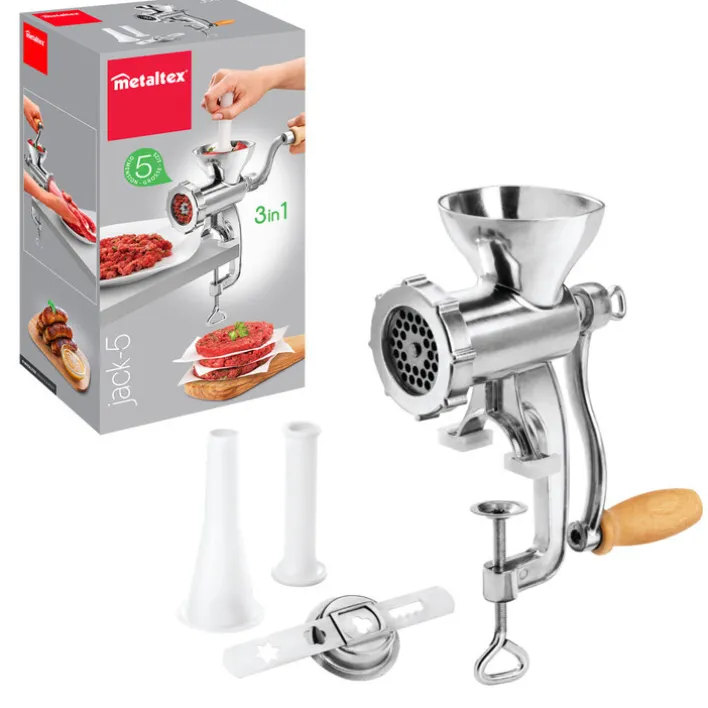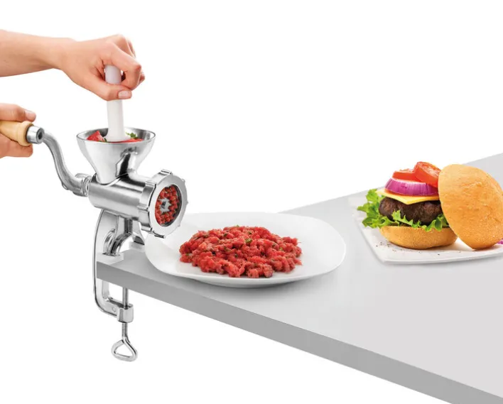 Der metaltex Fleischwolf JACK wird inklusive Holzkurbel und Tischbefestigung geliefert. Er kann auf einer extra starken Arbeitsplatte bis etwa 5,5 cm sicher befestigt werden.