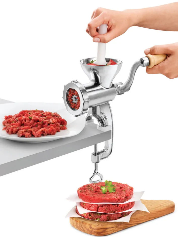 Dieser Fleischwolf ist der perfekte Helfer für echte Kochfans. Er besitzt einen Spritzgebäckaufsatz, einen Wurstfülltrichter und einen Stößel. Die Schnecke ist aus Hartkunststoff gefertigt. Das Gerät ist robust und langlebig und kann leicht gereinigt werden. Mit diesem Küchengerät wird das Hackfleisch für Ihre Gerichte immer frisch hergestellt und schmeckt mindestens so gut wie frisch vom Metzger. Es bringt auch Abwechslung in die Küche, denn Schwein, Rind, Lamm oder Huhn können hier verarbeitet werden. Lecker schmecken sicher auch die eigenen Wurstspezialitäten.