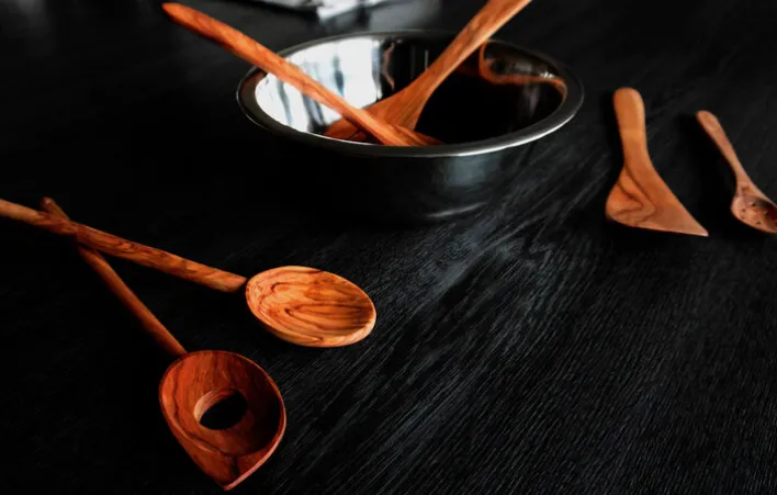Der elegant gestaltete Pfannenwender ist aus hartem Olivenholz gefertigt. Das verwendete Holz ist unbehandelt, hat glatt geschliffene Oberflächen und ist dadurch hygienisch und lebensmittelecht. Am Ende des Griffs ist eine kleine Bohrung angebracht, die zum Aufhängen des Pfannenwenders dient.