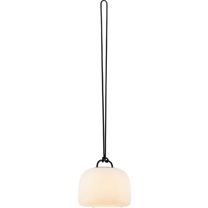 Die Akku LED Hängeleuchte KETTLE von Nordlux eignet sich optimal für den flexiblen Outdoor-Einsatz: Nutzer platzieren diese Leuchte mit schwarzer Aufhängung aus Metall und weißem, 22 cm breitem Schirm aus Kunststoff bequem auf dem Balkon, der Terrasse oder im Pavillon.