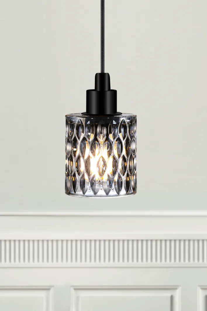 Die 1-flammige Retrofit Pendelleuchte HOLLYWOOD aus graufarbigem Glas sowie schwarzfarbigem Metall hat einen Durchmesser von 10,8 cm. Sie vereint klassische Gestaltungselemente mit moderner Formensprache.