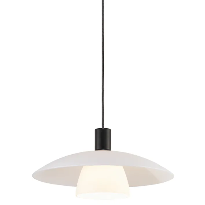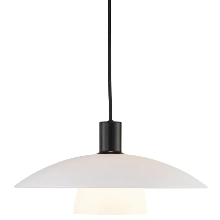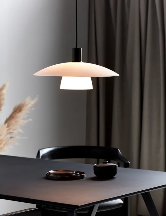 Kennzeichnend für die Retrofit Pendelleuchte VERONA der Marke Nordlux ist ein Schirm aus hochwertigem, milchig getöntem Opalglas. Er besteht aus einem flachen, tellerförmigen Teil sowie einem glockenartig gestalteten Element darunter. Dieser Aufbau sorgt dafür, dass ein Teil des Lichtes direkt nach unten abstrahlt, während ein anderer einen größeren Umkreis abdeckt. Beispielsweise für den Esstisch ist das optimal. Die E27-Fassung der Hängelampe kann eine einzelne, wechselbare Retrofit LED oder eine Glühlampe mit maximal 40 Watt aufnehmen.