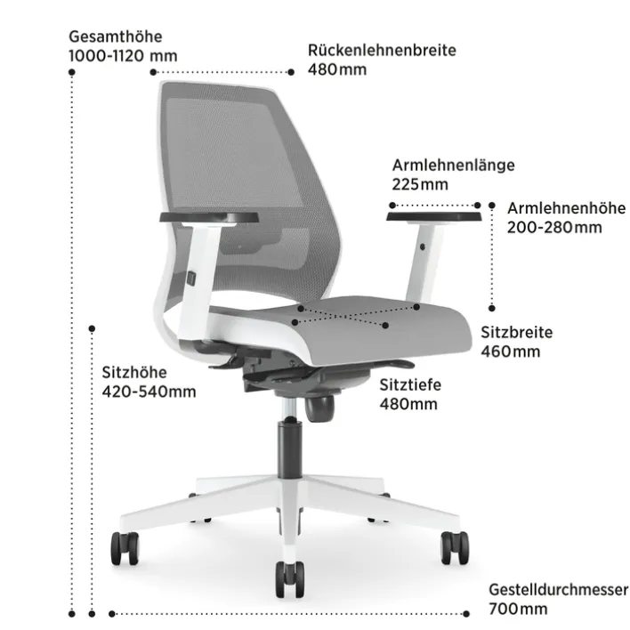 Der NOWY STYL Drehstuhl KENARI kombiniert ein weißes Kunststoffgestell mit einem grau bezogenen Sitz mit neigbarer Rückenlehne. Dank der Verwendung von hochwertigen Materialien ist der Schreibtischsessel mit bis zu 110 kg belastbar. Die Sitzhöhe lässt sich von 46 auf maximal 60 cm verstellen und somit optimal an den Schreibtisch anpassen. Darüber hinaus ist der Drehstuhl mit höhenverstellbaren Armlehnen mit schwarzen Armpads sowie einer Sitztiefenverstellung ausgestattet, die den Sitzkomfort weiter verbessern. Die verstellbare Lumbalstütze perfektioniert den Komfort des Drehstuhls.