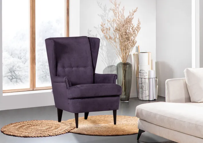 Der Ohrensessel „KAYLA“ aus der Serie Quartier vereint Komfort und Stil in einem eleganten Design. Mit einer Breite von 72 cm, einer Höhe von 104 cm und einer Tiefe von 85 cm bietet er großzügigen Sitzkomfort. Die Sitzhöhe beträgt 49 cm, während die Sitztiefe 53 cm misst, was eine entspannte Sitzposition ermöglicht. Die Armlehnenhöhe von 58 cm sorgt für zusätzlichen Komfort. Der Sessel ist in einem ansprechenden Lila gehalten, das durch den Einsatz von hochwertigem Flachgewebe aus 100 % Polyester besticht.