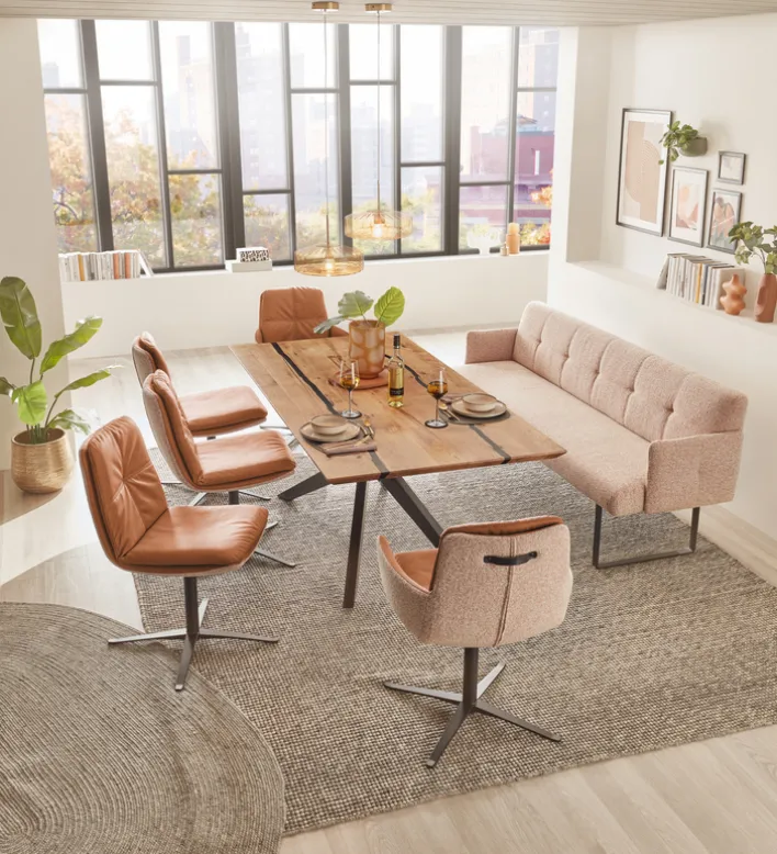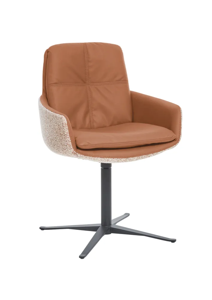 MADINA von Ole Gunderson zeigt sich außen mit einem wunderschönen Flachgewebe in Donna Rusty Melange und innen in Cloud Brandy. Der Armlehnstuhl ist gepolstert und besitzt einen drehbaren Viersternfuß aus mattem schwarzem Metall. Außerdem verfügt MADINA über einen aparten Ledergriff. Mit einer Breite von 63 cm, einer Höhe von 90 cm und einer Tiefe 66 cm macht sich der Armlehnstuhl im heimischen Arbeitszimmer ebenso gut wie im Wohnzimmer. Die Armlehnen sind fest und tragen zu einem hohen Sitzkomfort bei.