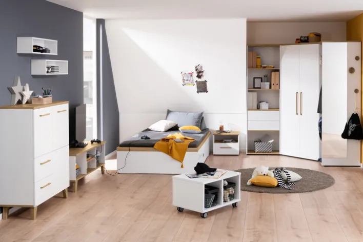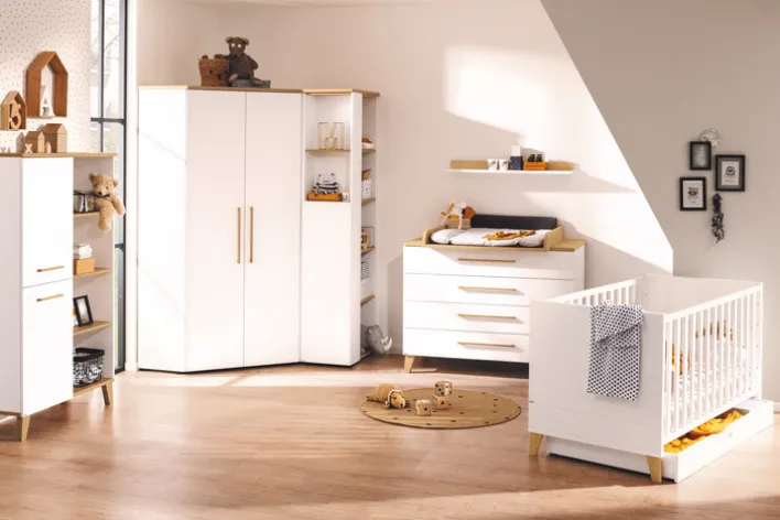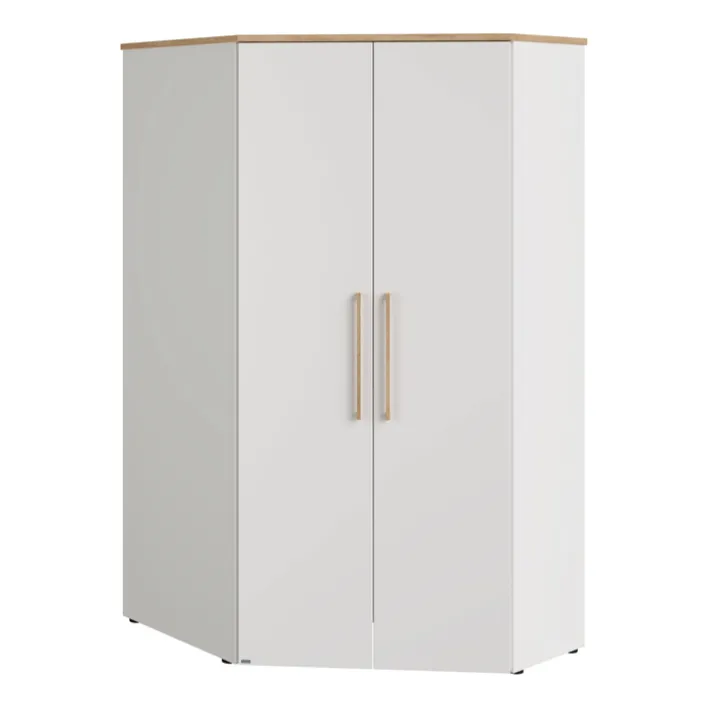 Der elegante Eck-Kleiderschrank OSCAR in weißer Farbe ist nicht nur ein echter Hingucker, sondern überzeugt auch durch die Ausnutzung der Raumecken als echtes Platzwunder. Der Kleiderschrank mit einer Höhe von 206 cm und einer Breite von knapp über einem Meter lässt sich zudem problemlos mit weiteren Schränken der Serie ergänzen und bietet ausreichend Stauraum in ansonsten ungenutzten Raumecken.