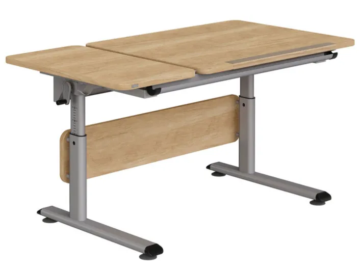 Die in Eiche Nebraska ausgeführte Tischplatte wird beim Schreibtisch GT von einem standfesten Gestell mit brauner Oberfläche getragen. Das Besondere an der abgerundeten Platte ist die Anpassungsfähigkeit. Sie ist zweigeteilt und kann nach Belieben montiert werden. Zwei Drittel der Fläche sind stufenlos verstellbar, der maximale Neigungswinkel beträgt 19 Grad. Mittels Kurbel lässt sich die Höhe der Arbeitsplatte den Bedürfnissen des Nutzers anpassen. Das Herunterfallen von Stiften und Ähnlichem verhindert eine zwischen den Platten integrierte Streifenbürste. Ablagemulde, Taschenhaken und Lineal runden die Ausstattung ab.