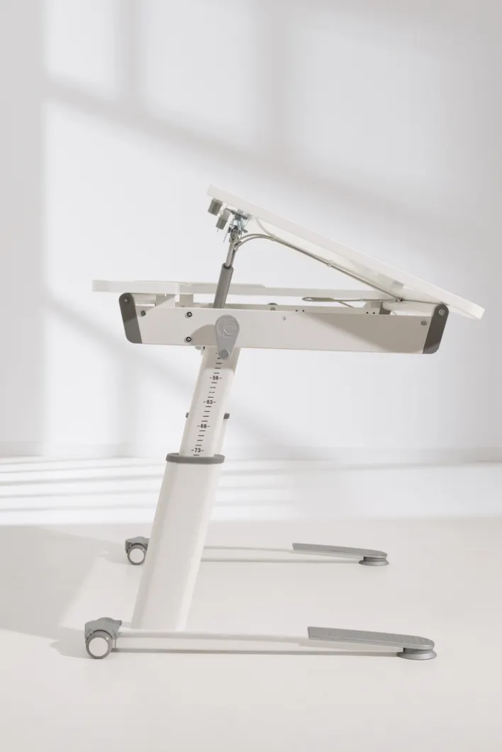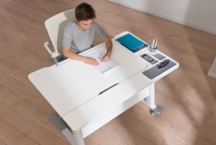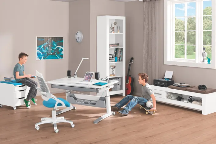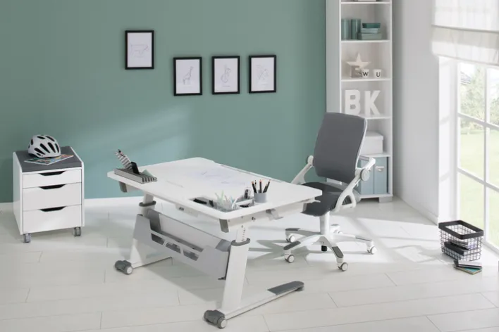 Der moderne Schreibtisch JARO von PAIDI im attraktiven Farbton kreideweiß überzeugt durch sein stilvolles Design und ist eine praktische Ergänzung für das geschmackvoll eingerichtete Kinder- oder Jugendzimmer. Kombiniert mit einem hochwertigen Bürostuhl aus der Möbelserie entsteht ein elegantes Ensemble. Die Tischplatte und die Ablage bieten viel Platz und zusätzlichen Stauraum. Der Schreibtisch ist individuell höhenverstellbar und mit jeweils zwei Möbelrollen an den Füßen einfach umzustellen.