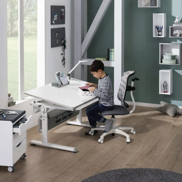 Der Schreibtisch ist das ideale Möbel für ein Kinderzimmer. Er punktet mit moderner Gestaltung, robustem Erscheinungsbild und praktischen Funktionen. Dank der neutralen und zeitlos attraktiven Farbgebung passt er in jedes Umfeld