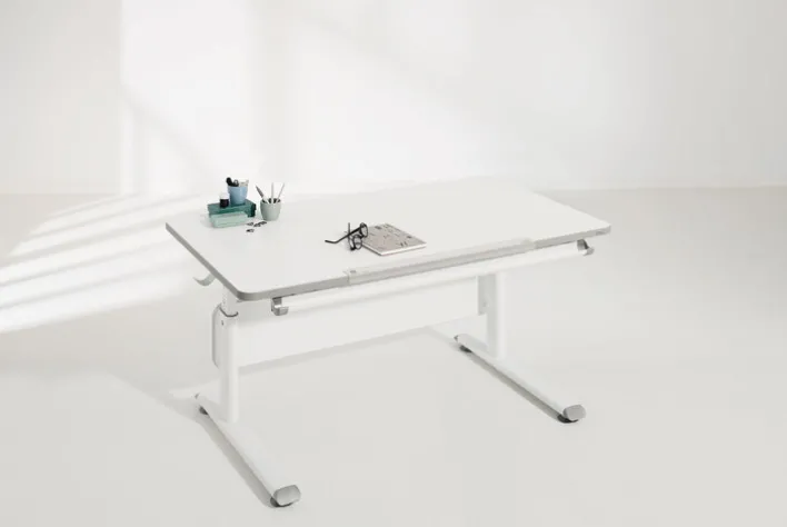 Mit seiner optimal dimensionierten Tischplatte gibt der Schreibtisch einem Kind genügend Platz für Schularbeiten und ermöglicht ergonomisch korrektes Sitzen. Mittels abnehmbarer Kurbel wird die Höhe den Bedürfnissen des Kindes angepasst. Drei integrierte Rasterscheren ermöglichen die Schrägstellung der Tischplatte bis maximal 19 Grad. Das standfeste Gestell kann für die horizontale Ausrichtung dem Fußboden angepasst werden. Zum Lieferumfang gehört ein Lineal, welches zudem als Kantenschutz fungiert und ein Abrutschen von Stiften und Co. verhindert. An beiden Seiten montierbare Taschenhaken runden die Ausstattung ab.