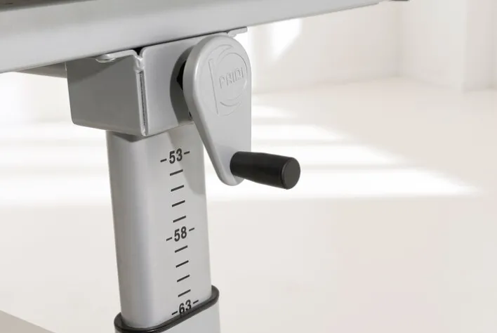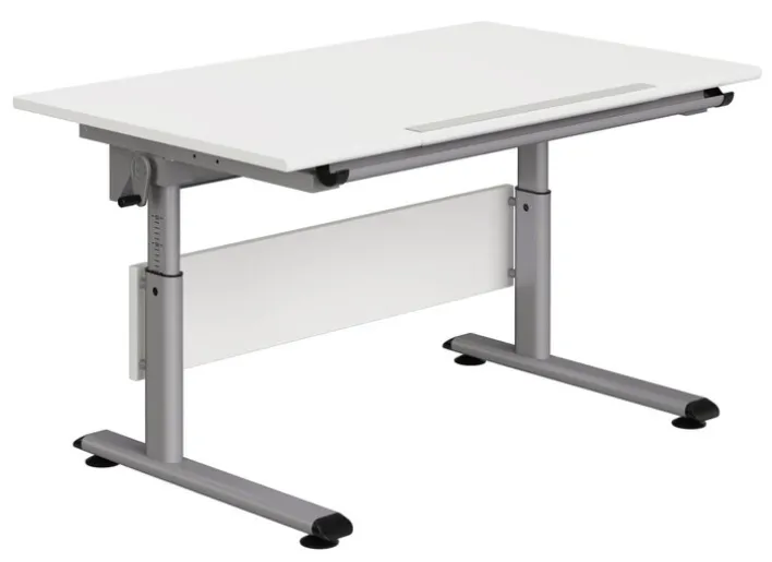 Die kleinen werden so schnell groß! Aber dafür gibt es schließlich verstellbare Kinderschreibtische. Mit der Zentimeterangabe und einer Kurbel an der Seite, kann die erwünschte Höhe schnell und bequem eingestellt werden. Mit der weißen und silbernen Farbe lässt sich der Schreibtisch sowohl einem Mädchen- als auch einem Jungenzimmer anpassen. Für eine bequemere Haltung kann die Tischplatte auch Schräg gestellt werden. Die Ablageschale und das Lineal am Tischrand sowie die Abrutschleiste direkt darunter bieten weitere Annehmlichkeiten. Durch den Haken für die Schultasche findet auch diese ihren geordneten Platz im Kinderzimmer.