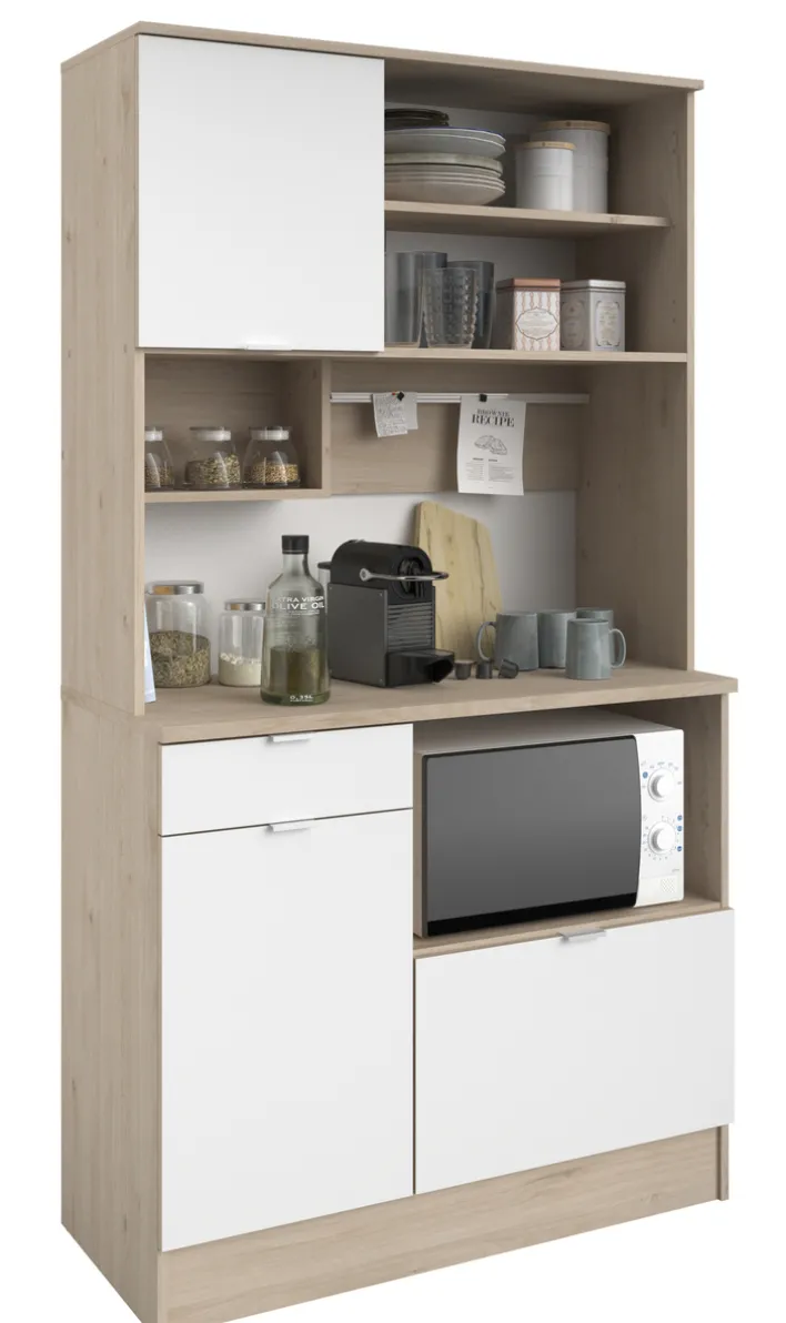 Der Buffet-Schrank bietet insgesamt drei verschlossene Fächer und eine Schublade und weiteren offenen Stauraum auf verschiedenen Etagen. Mit seiner Farb-Kombination aus Eiche Jackson und weißen Türen passt sich der Schrank zeitlos und elegant in jede Küchenumgebung hervorragend ein. Die glatten Oberflächen sind nicht nur beständig, sondern auch einfach zu säubern und überzeugen durch ihre zeitlose Eleganz.