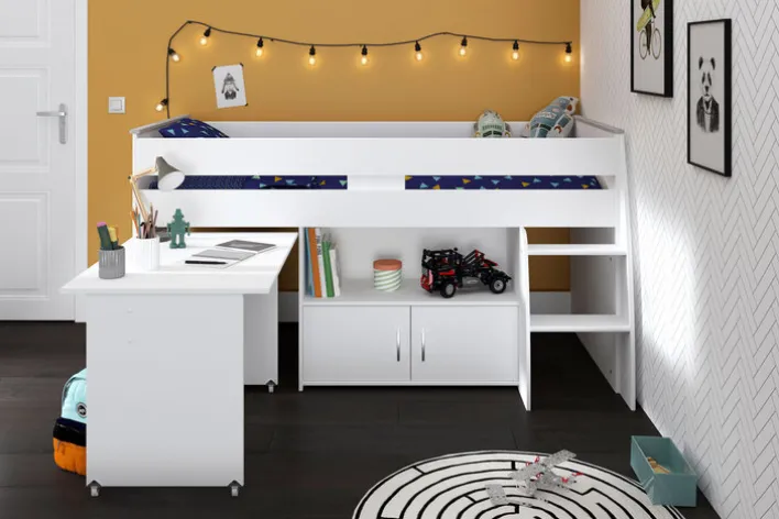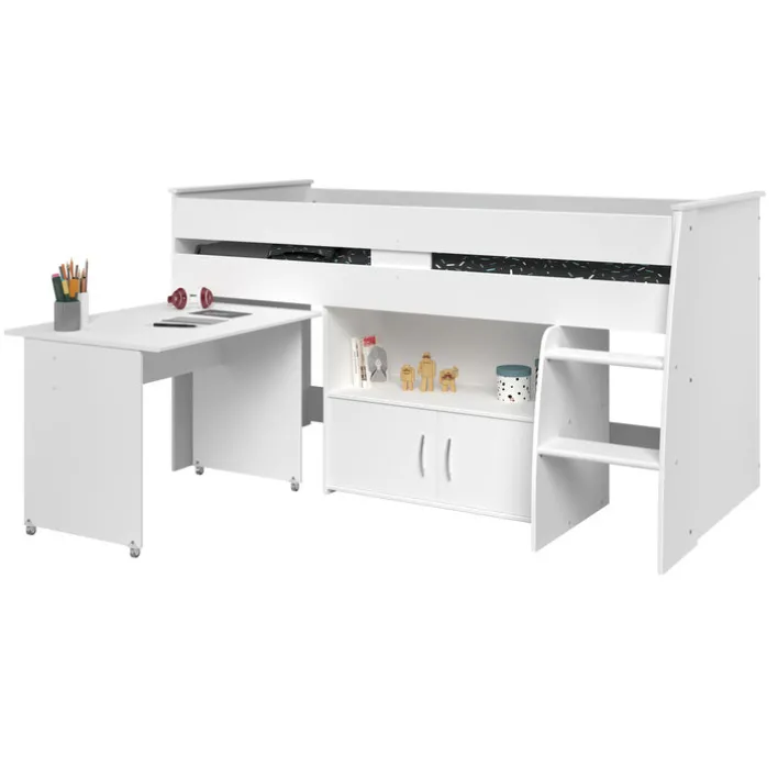 Parisot Halbhohes Hochbett REVERSE 1 weiß hat eine 90 x 200 cm große Liegefläche. Es ist 204 cm lang, 177 cm hoch und verfügt über eine integrierte Leiter. Da auch ein ausziehbarer Schreibtisch zur Ausstattung gehört, handelt es sich um ein multifunktionales Möbelstück zum Schlafen, Entspannen und Arbeiten. Es wiegt 100 kg bei einer maximalen Belastbarkeit von 80 kg.