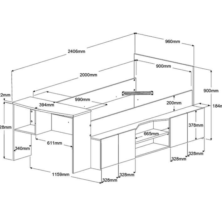 Das halbhohe Parisot Hochbett CLEO 1 besteht aus weiß folierter Holznachbildung und hat eine Größe von 116 x 90 x 241 cm. Am unteren Ende des Bettes befindet sich ein kleiner Schreibtisch, auf dem der Nachwuchs die ersten Hausaufgaben erledigen kann. Zusätzlich bietet es ein breites Regal, in und auf dem alles Platz findet, was in der Nähe des Bettes benötigt wird. Lattenrost und Matratze für die 90 x 200 cm große Liegefläche sind gesondert im Shop bestellbar.