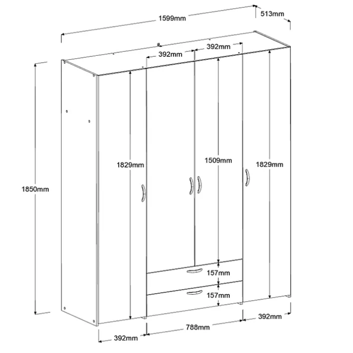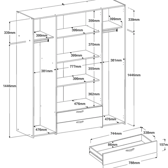 Anzahl Drehtüren inklusive: 4Anzahl Kleiderstangen inklusive: 2 Stk.Anzahl Schubkästen inklusive: 2Anzahl Einlegeböden inklusive: 6