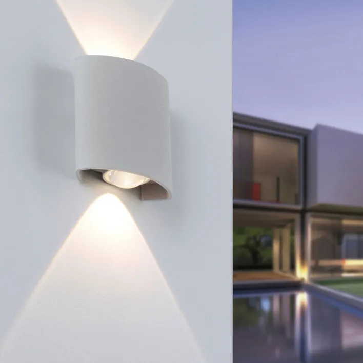 Die integrierten LED-Lichtquellen erzeugen ein Up & Down Licht mit einer warmweißen Farbtemperatur von 3.000 Kelvin und einer Helligkeit von 220 Lumen je Lichtquelle. Beide LEDs sind fest verbaut und nicht austauschbar. Der Energieverbrauch liegt bei maximal 1,7 Watt pro Lichtquelle, die Lebensdauer beträgt 20.000 Stunden. Die Leuchte lässt sich nicht dimmen und besitzt weder Bewegungsmelder noch Dämmerungssensor. Der Anschluss erfolgt über Netzbetrieb. Die Kombination aus robustem Material, moderner Technik und klarer Formensprache macht diese Außenwandleuchte zu einer zuverlässigen Lösung für den Außenbereich.