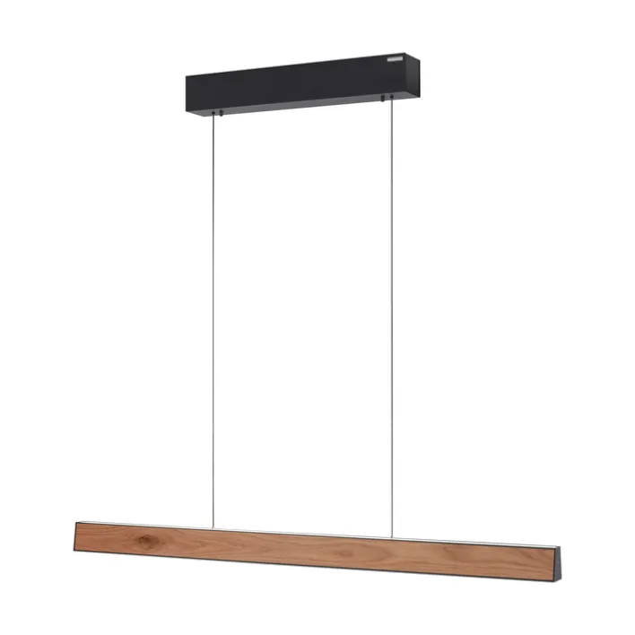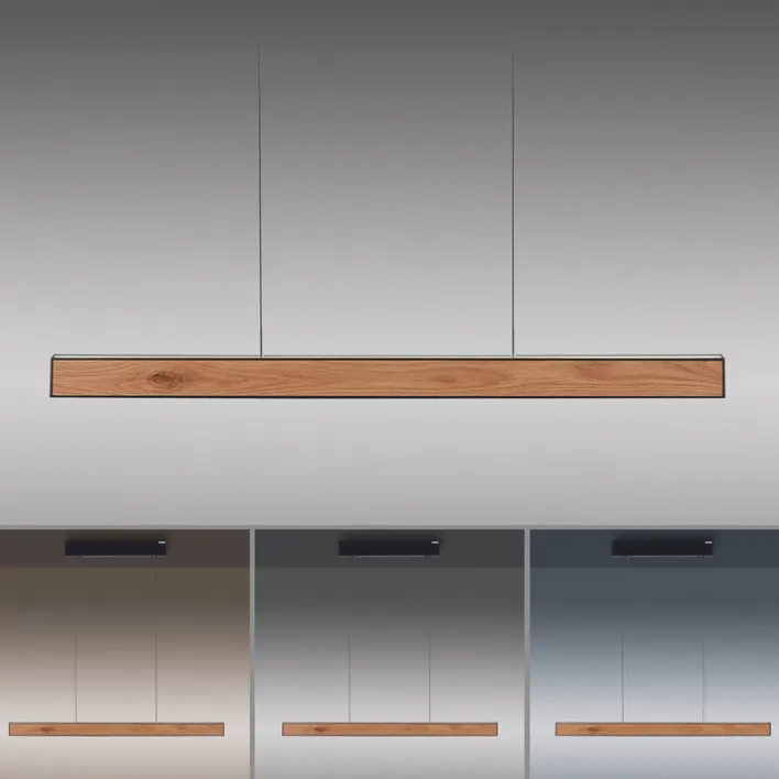 Mit dem schwarz-braunen LED-Balkenpendel PURE E-MOTION sichern sich Käufer ein optisches und funktionales Highlight. Die Pendelleuchte aus Aluminium und Holz weist Highlights wie einen E-Lift und eine Farbsteuerung auf. Der freischwingende Balken dieser Deckenleuchte beinhaltet zwei fest eingebaute LED-Leuchtmittel mit unterschiedlicher Helligkeit: Die Werte betragen 2.750 und 1.600 Lumen. Die Farbtemperatur beider Leuchtmittel lässt sich in einer Bandbreite von 2.700 bis 5.000 Kelvin individuell einstellen, sodass die Leuchte PURE E-MOTION ein breites Spektrum von warmweiß bis kaltweiß abdeckt. Dimmbar ist diese Designleuchte von Paul Neuhaus ebenfalls. Besondere Erwähnung verdient der praktische E-Lift-Antrieb für die Höhenverstellung. Sämtliche Einstellungen nehmen Nutzer komfortabel mit der mitgelieferten Fernbedienung vor!