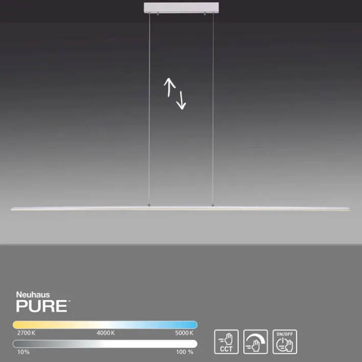 Vor allem in minimalistischen Wohn- und Esszimmern wirkt das LED Balkenpendel PURE-LITE von NEUHAUS besonders elegant. Die Bedienung der Leuchte erfolgt über eine Gestensteuerung mittels zweier Sensoren oberhalb des Lichtbalkens. Die fest verbauten LEDs lassen sich ganz einfach dimmen oder in der Lichtfarbe verstellen. Über die Memory Funktion sind gespeicherte Modi schnell abrufbar. Mit bis zu 3000 Lumen ist für ausreichend Helligkeit in jeder Situation gesorgt.