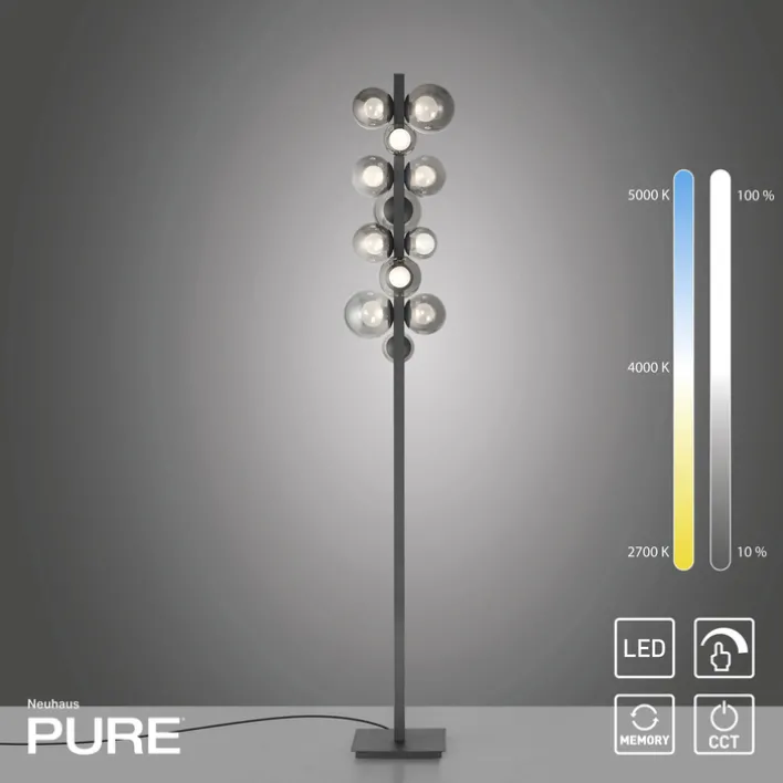 Das deutsche Design der LED Stehlampe PURE POPUP von Paul Neuhaus ist ebenso klassisch wie modern. Zudem sorgt der 12-flammige Aufbau für eine glanzvolle Erscheinung. Die 12 fest eingebauten LED-Leuchtmittel mit jeweils 2,4 Watt befinden sich in Kugeln aus hochwertigem Rauchglas. Zusammen bringen sie es auf eine Leistung von 28 Watt sowie eine dimmbare Helligkeit von bis zu 3.456 Lumen. Als weitere Besonderheit ist die Farbtemperatur der LEDs zwischen 2.700 und 5.000 Kelvin beziehungsweise von Warmweiß bis Neutralweiß einstellbar.