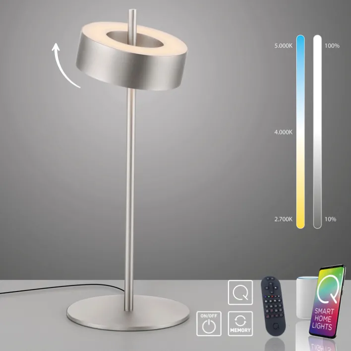 Die alu- und nickelfarbige LED-Tischleuchte Q-ROTATE 16 cm vereint ein schickes Design mit einem hohen Bedienkomfort. Als flexible Wohnraumleuchte aus Aluminium spendet sie optimales Up & Down Licht, die Farbtemperatur lässt sich mit einer Fernbedienung individuell einstellen.
