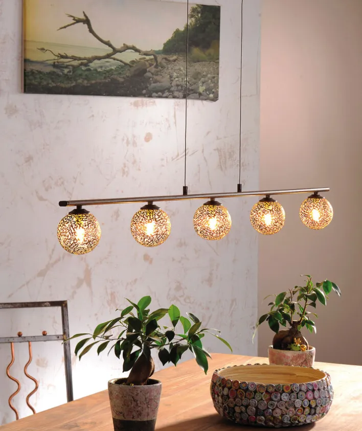 Die Paul Neuhaus Retrofit Pendellampe GRETA sorgt mit einem rostfarbigen Pendel, an dem fünf goldfarbige Kugeln befestigt sind, auf 132 cm für eine schöne Ausleuchtung des Esstisches. Mit ihrem filigranen Muster zaubern die Kugeln zudem wunderschöne Lichteffekte an Wand, Decke und Tisch. Zudem kann die Pendellampe in der Höhe verstellt werden. Für den Betrieb der CE-geprüften Pendelleuchte werden fünf Leuchtmittel mit G9 Fassung benötigt. Verwenden lassen sich 40 Watt Retrofit Glühbirnen ebenso, wie 8 Watt LED Leuchtmittel.