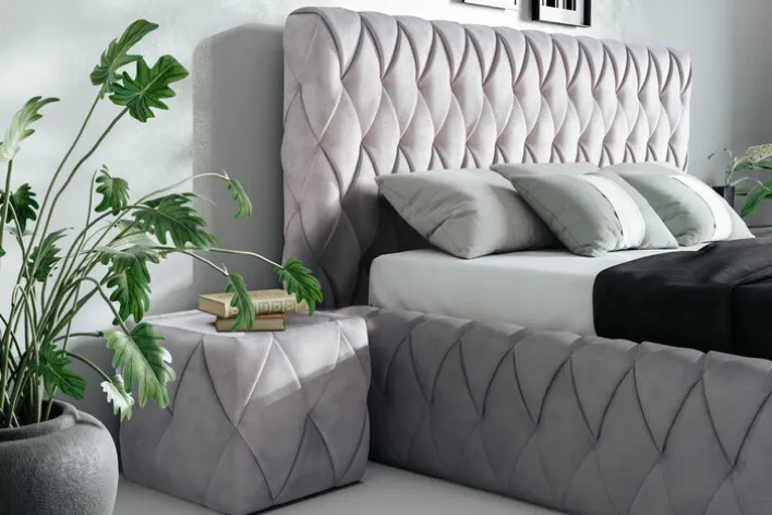 Die hohe Rückenlehne macht das Polsterbett zu einem echten Hingucker.
