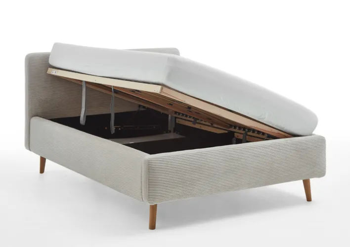 Das Polsterbett MATTIS zeigt eine Liegefläche von 140 x 200 cm (Breite x Länge). Es besitzt einen eleganten Bezug in Cord beige. Im Lieferumfang ist keine Matratze, aber ein Lattenrost enthalten. Die Holzfüße sind eichefarbig. Zusätzlich bietet es einigen Stauraum.